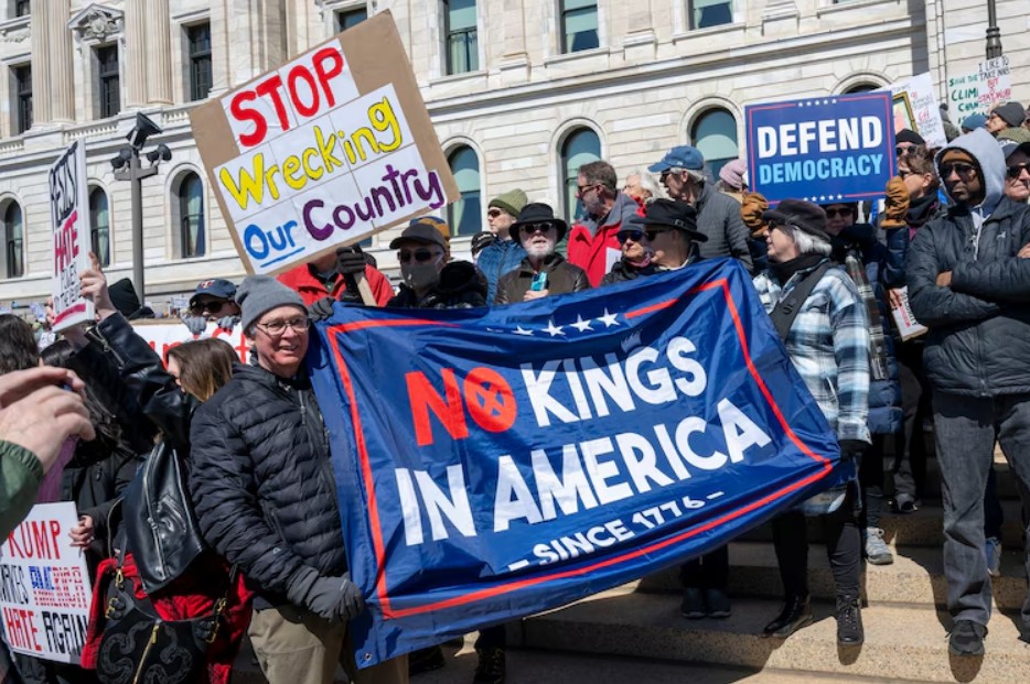 The "No Kings" events across U.S. cities and towns were mostly calm and organized, with the theme that no one is above the law. Protestors, raising signs and chanting in many areas drenched by rain, were also met with confrontations and counterprotests.