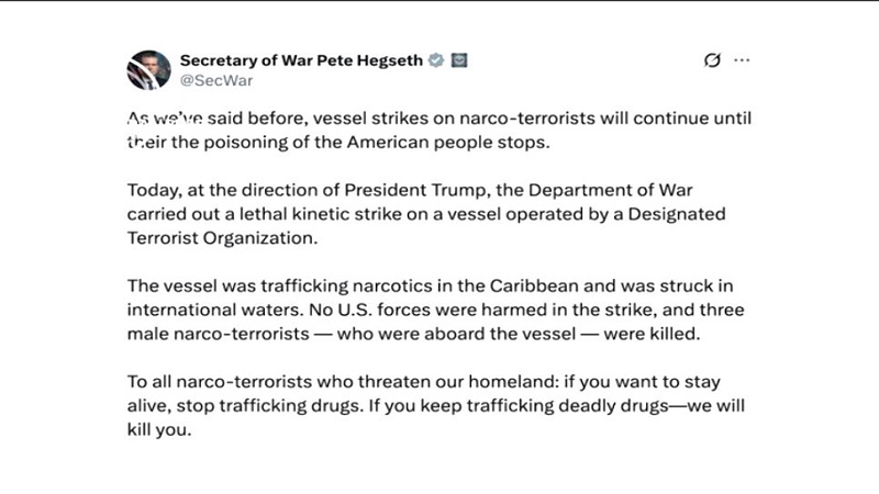 In a post on social media platform X, U.S. War Secretary Pete Hegseth claimed the vessel was operated by a “Designated Terrorist Organization,” but provided no supporting evidence. He attached a 20-second video, labeled “unclassified,” showing a small boat being hit by a munition before exploding.