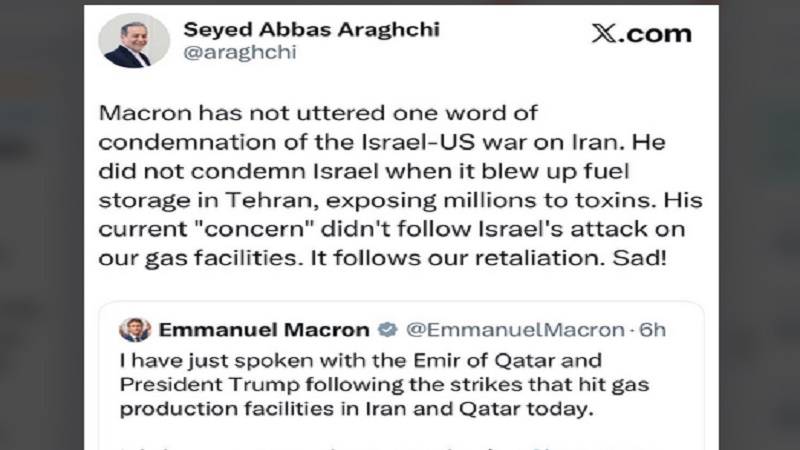 Araghchi highlighted Macron's silence during a previous Israeli attack involving fuel depots in Tehran and noted that Macron's current "expression of concern" only emerged after Iran's retaliatory strike on gas facilities, which Araghchi deemed "sad."
