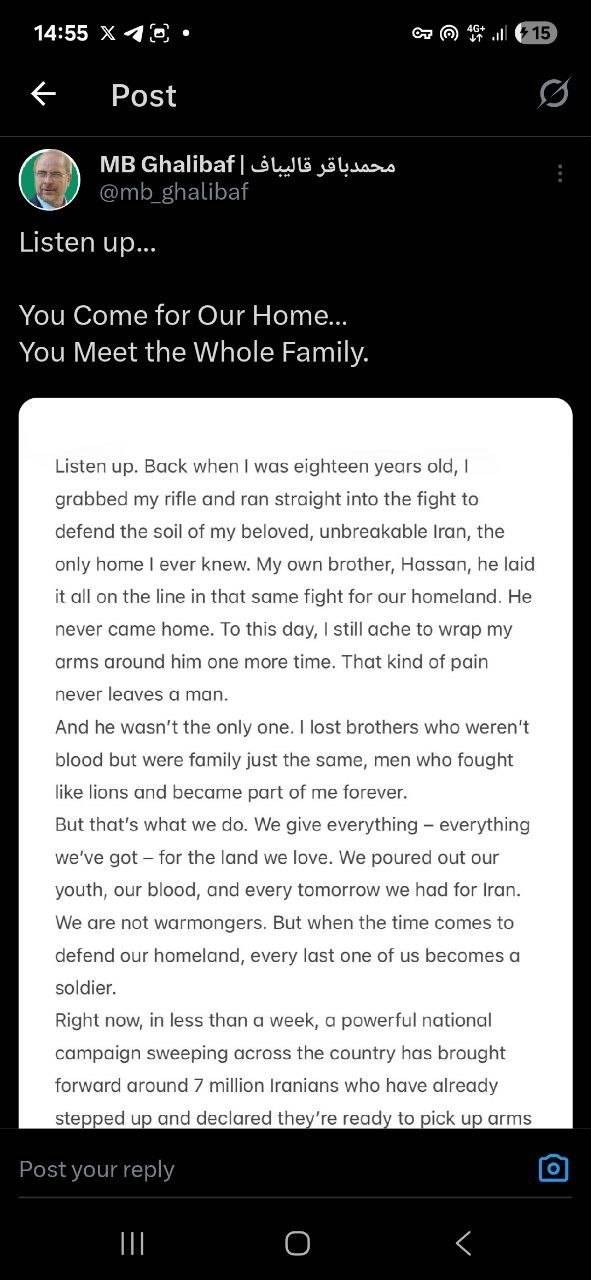 Qalibaf wrote on X on Thursday: "Listen up. Back when I was eighteen years old, I grabbed my rifle and ran straight into the fight to defend the soil of my beloved, unbreakable Iran, the only home I ever knew. My own brother, Hassan, he laid it all on the line in that same fight for our homeland. He never came home. To this day, I still ache to wrap my arms around him one more time. That kind of pain never leaves a man."