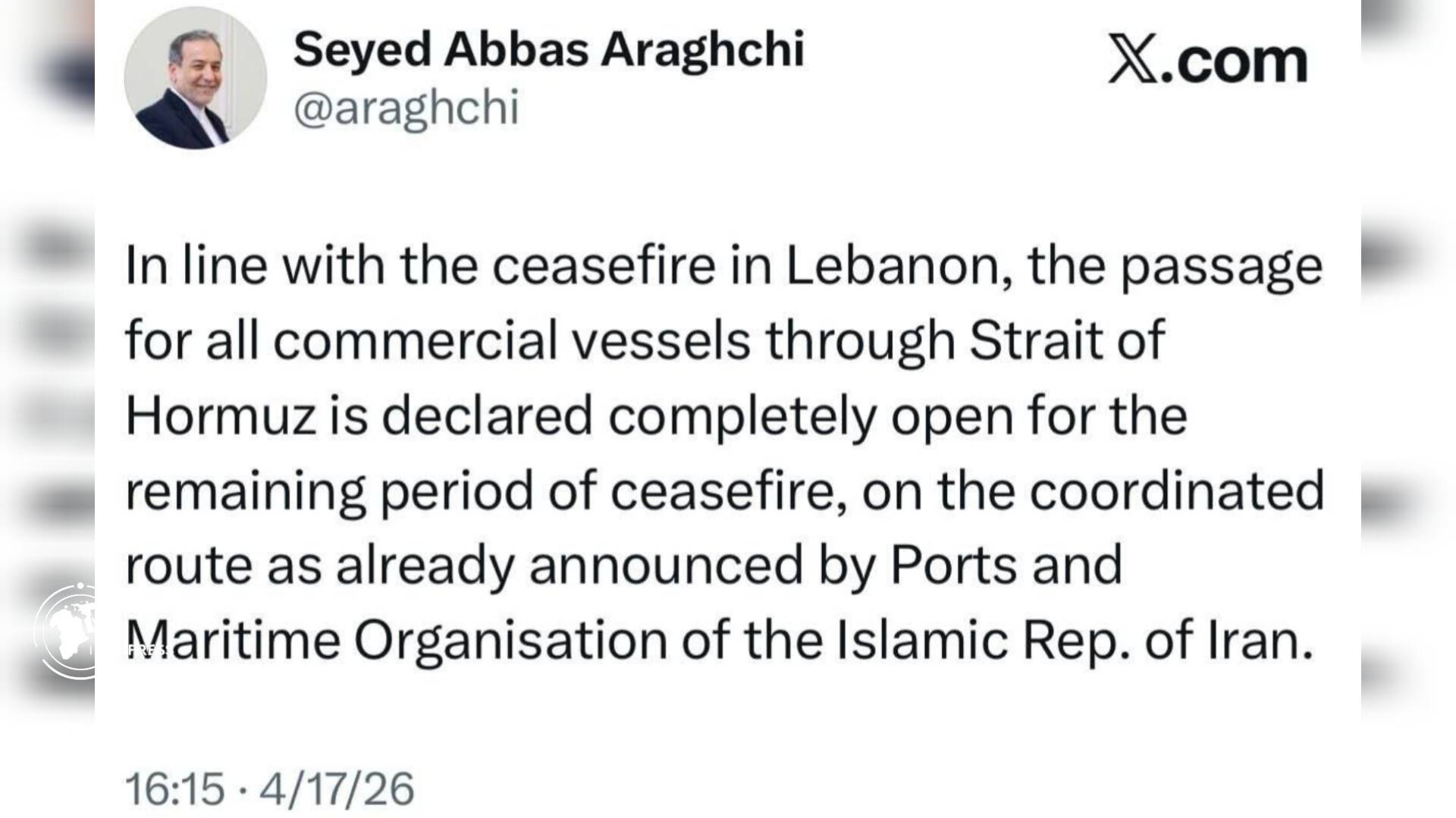 Foreign Minister Abbas Araghchi, in a post on X platform, stated that "in line with the ceasefire in Lebanon, passage for all commercial vessels through the Strait of Hormuz is declared completely open for the remaining period of the ceasefire" and specified that commercial traffic will proceed "on the coordinated route as already announced by the Ports and Maritime Organisation of the Islamic Republic of Iran."