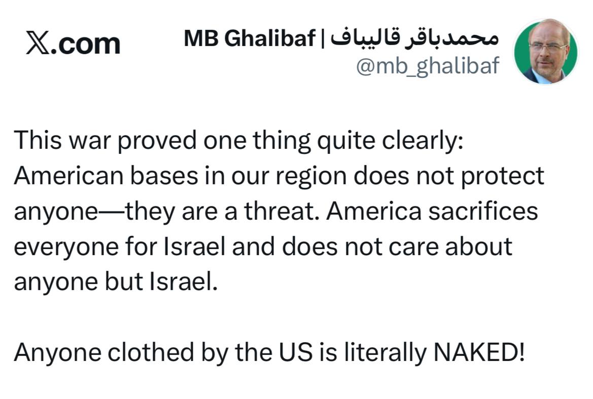 Iran’s parliament speaker Mohammad Baqer Qalibaf said the current regional war has exposed U.S. military bases as sources of instability rather than protection, saying that Washington has been prioritizing Israel at the expense of its regional partners.